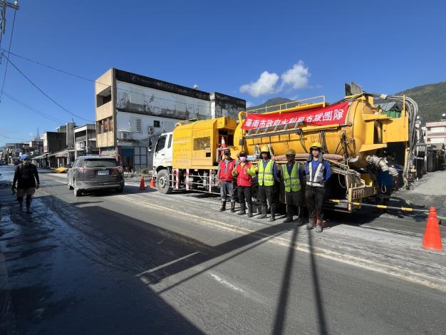 為幫助花蓮光復鄉泥石流災區復原,黃偉哲市長特地指派市府水利局出動高壓吸泥車投入下水道及側溝淤泥清除等工作,以機具清理人力無法挖除的管道內污泥,加速復原災區街道排水功能。支援人力機具於10月5日完成階段性任務後光榮返鄉。