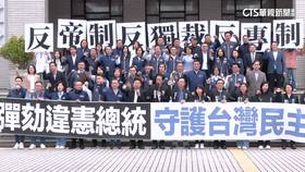 國民黨與民眾黨立委說:「反帝制,反獨裁,反專制。」手舉布條高喊口號,藍白立委議場外全體總動員,為的就是要彈劾總統賴清德。立法院國民黨黨團總召傅崐萁說:「賴清德已經完全不在乎全國的民意,就是要毀掉台灣的民主,讓他能夠恣意妄為,國會已經沒有辦法來監督這個總統,這個怪獸的總統。」