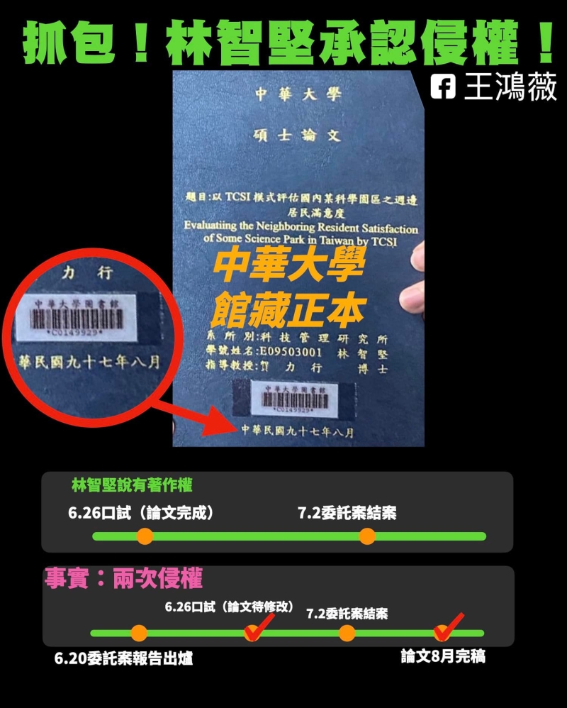 林智堅辯護侵權荒腔走板,用錯誤概念,聲稱因為論文於標案結案之前所以沒有侵權,沒想到中華大學的論文正本封面,上面說明林智堅是2008年8月完稿,等於宣判林智堅侵權事實,連審都不用審!