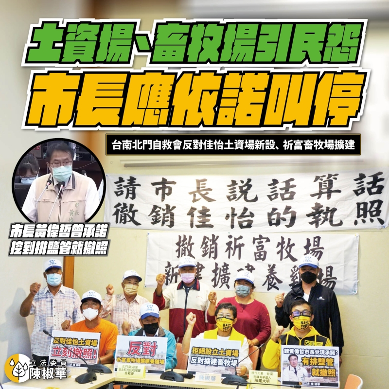 #佳怡工程 公司要在台南北門區錦湖里設立土石方回收堆置場,居民擔心危害農民生計,上午我協助自救會召開「西瓜市長狂許可畜牧場又一樁!北門居民反對設土資場、養雞場」記者會,要求南市府開挖土資場預定地,確認地下的 #鹽份改良管,並請黃偉哲市長兌現承諾,撤銷佳怡工程的土資場許可,維護農民生計與農田安全,也勿同意 #祈富畜牧場 再擴建養雞場,以保護農村自然生態環境與品質。
