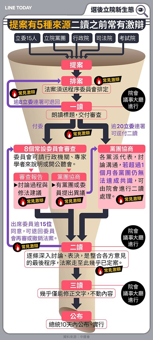 第11屆新科立委將在2月1日報到,並選出立法院正副院長,藍綠兩黨立委數均未過半(57席),第3小黨將成表決時的關鍵票。而日後的立法院的立法攻防中,又會在哪個環節?產生何種新的合縱連橫呢?LINE TODAY圖解立法院運作架構,提供您多一些思考面向。