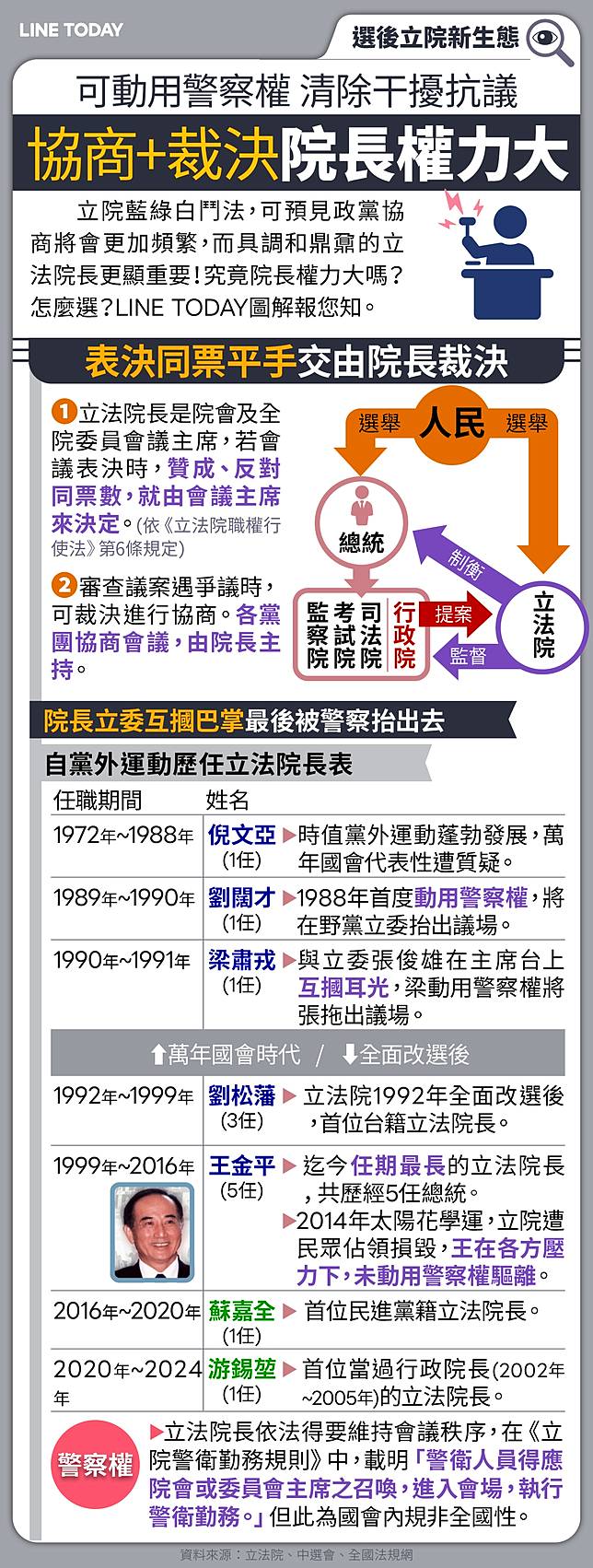 立院藍綠白鬥法,可預見政黨協商將會更加頻繁,而具調和鼎鼐的立法院長更顯重要!究竟院長權力大嗎?怎麼選?能罷免嗎?院長如何動用警察權?院長薪水好不好?LINETODAY圖解一次報您知。