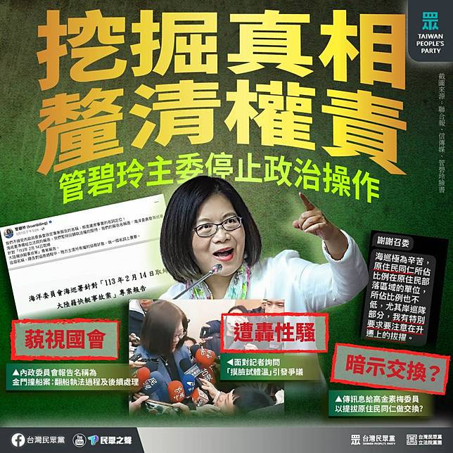 民眾黨表示,取締三無船隻、根據SOP嚴正執法、兼具人道關懷,釐清真相與權責,不應互斥,管碧玲身為主委卻只糾結專案報告的「名稱」,滿口政治語言,事發當下沒有畫面、SOP解釋不清,根本無助保障台灣漁民權益、緩解兩岸情勢。