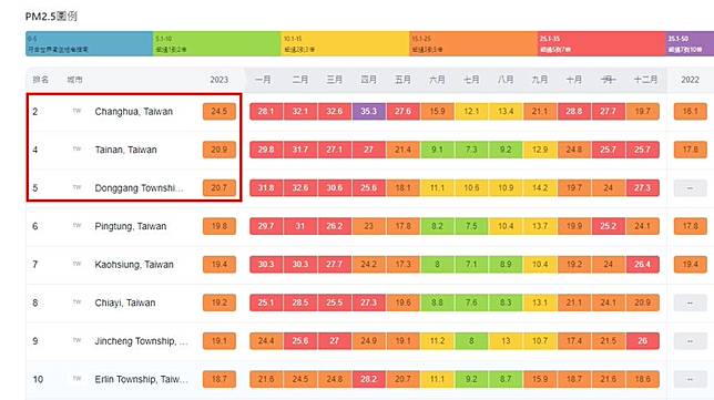 回到台灣,根據網站顯示,台灣空氣品質最不佳前3名分別為彰化、台南和屏東東港,空氣品質皆超標3-5倍。
