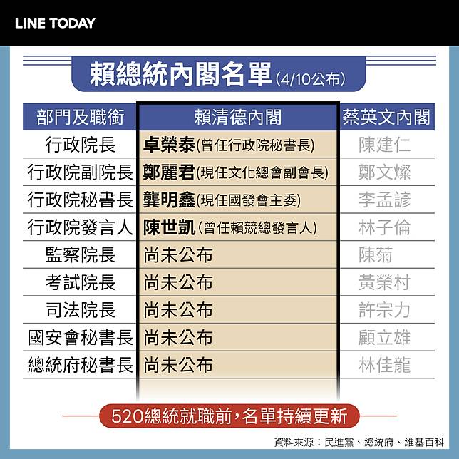 準總統賴清德將於5月20日就任,在此之前將陸續公布內閣人事,尤其行政及國安體系備受注目,而五院院長中除行政院長由總統任命、立法院是由立委互選出,其他三院院長任命是由總統提名經立法院同意,跟著LINE TODAY圖解,秒懂總統如何佈局國家未來!(人事更新進度:4月10日公布)