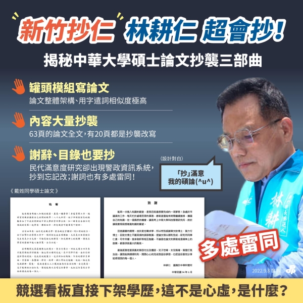民進黨:林耕仁,超會抄! 揭秘中華大學碩士論文抄襲三部曲