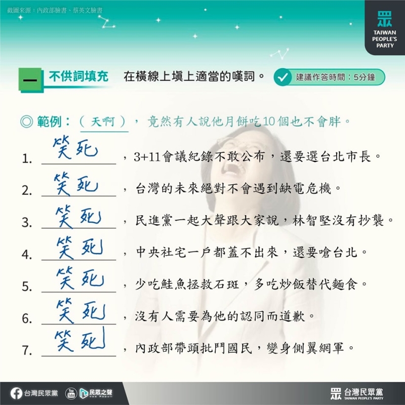 先前海巡署以防治豬瘟暗諷藝人「有病」,被轟踰越公私界線;公視台語台酸在野黨主席「練痟話」,27天之後才願意檢討,如今機關層級大躍升,竟是由內政部做哏圖「笑死」,聯手側翼網軍抹紅,看到的人根本笑不出來。