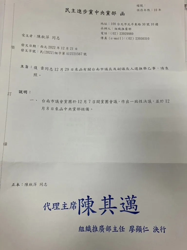 陳秋萍提醒邱莉莉,當時黨中央尚在處理代理主席相關事宜之際,由舊總召劉米山(未當選)不預警通知新當選議員,召開第一次黨團會議,且不預警通知要討論第四屆正副議長事宜,當時的黨團會議已違反程序,且當時中常會未通過誰是台南督導小組,因此包括她在內幾位議員在黨團會議時希望暫緩,讓程序更加完備,結果邱莉莉竟然說「我就是很想要做」。