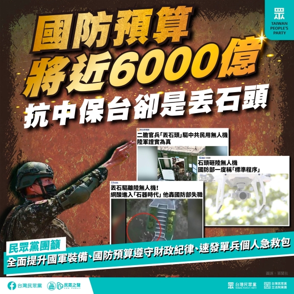 民眾黨:國防預算將近6000億元,離島官兵卻只能丟石頭,這樣的國防要如何讓國人安心。